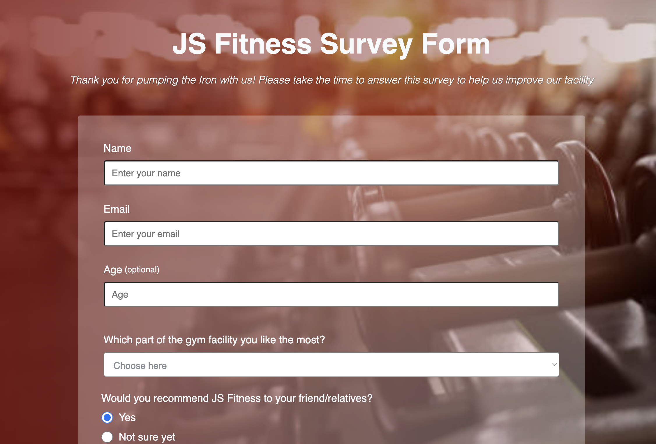 Survey form for existing clients of a Fitness Gym to get subscribers' feedback, know what are the things to improve and what could be done better.